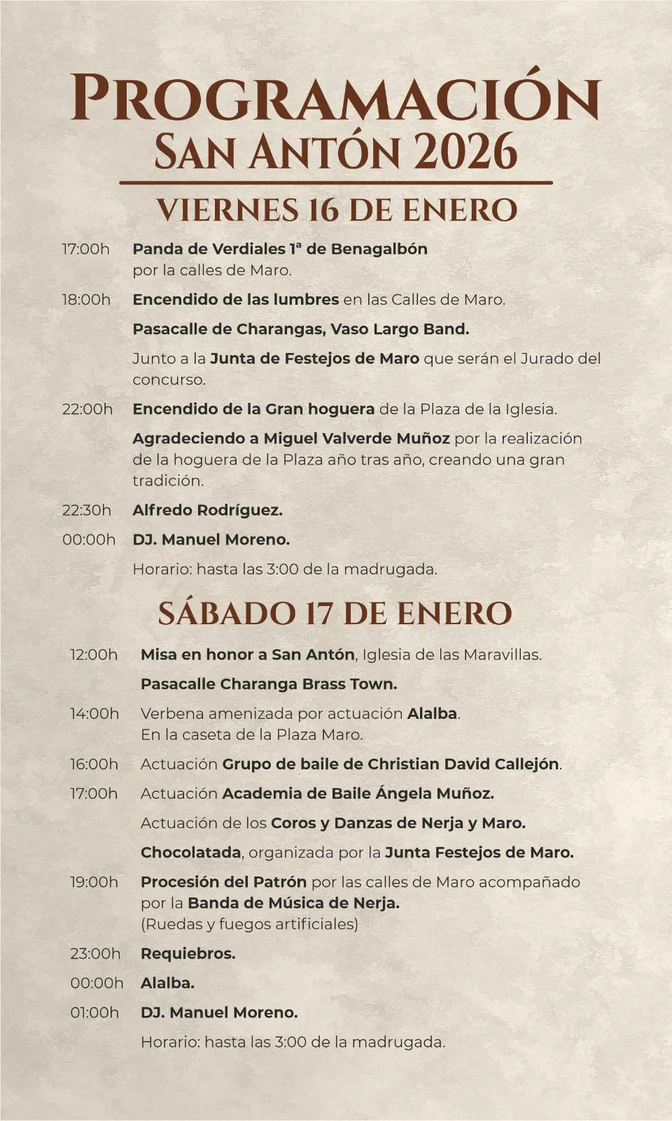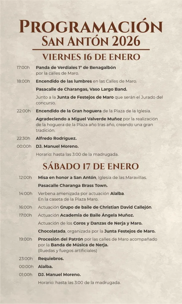 San Antón is traditionally celebrated on 16th and 17th January, with JANUARY 17TH being the main day, as it is the feast day of Saint Anthony the Abbot. In Maro, events are usually scheduled around the closest weekend, with minor variations each year depending on the calendar.
