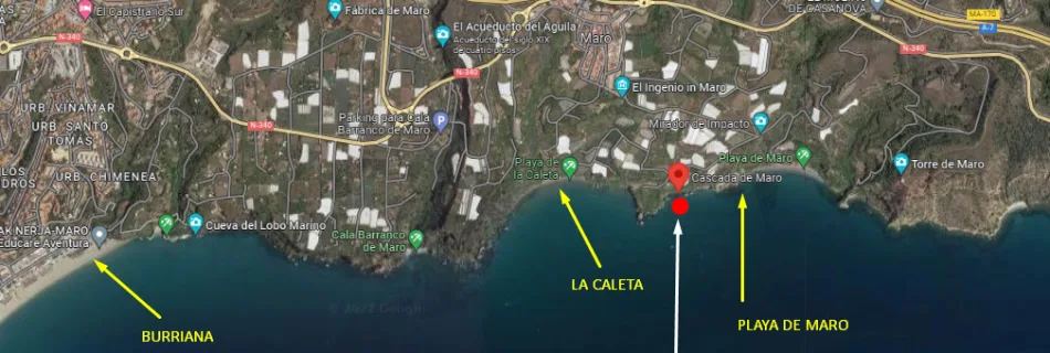 The Maro waterfall is between La Caleta beach and Maro beach. (the two beaches of Maro). But if you want to go kayaking then you have to rent a kayak. You can rent it at Burriana beach and or Maro beach.