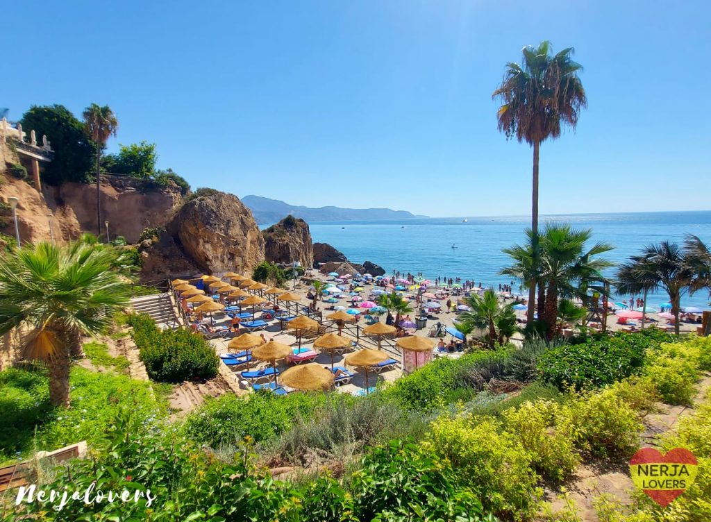 This is the closest beach to Nerja’s Balcon de Europa. Near the beach we find some hotels just 500 metres away, restaurants and cafes, and there is a sun lounger service on the beach itself.