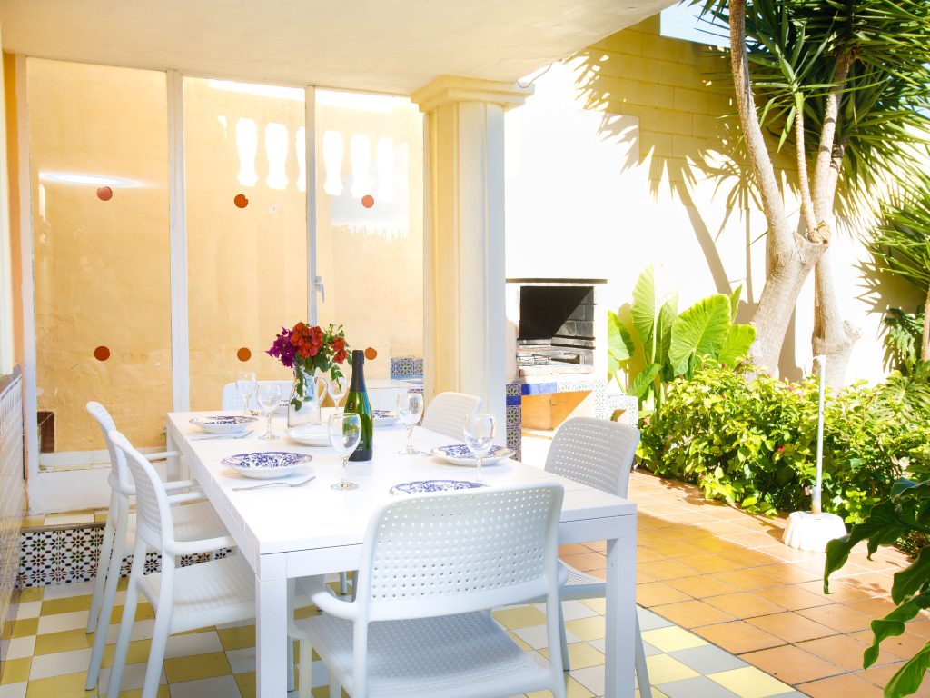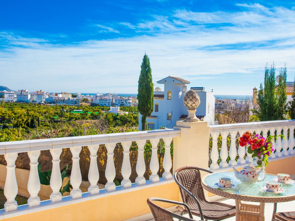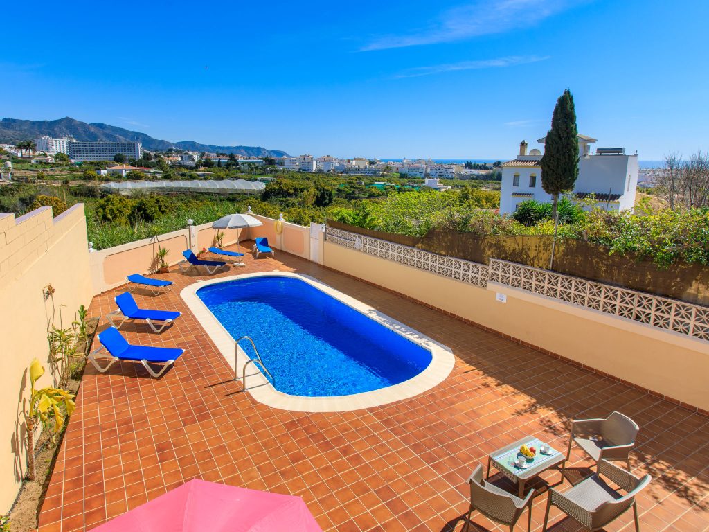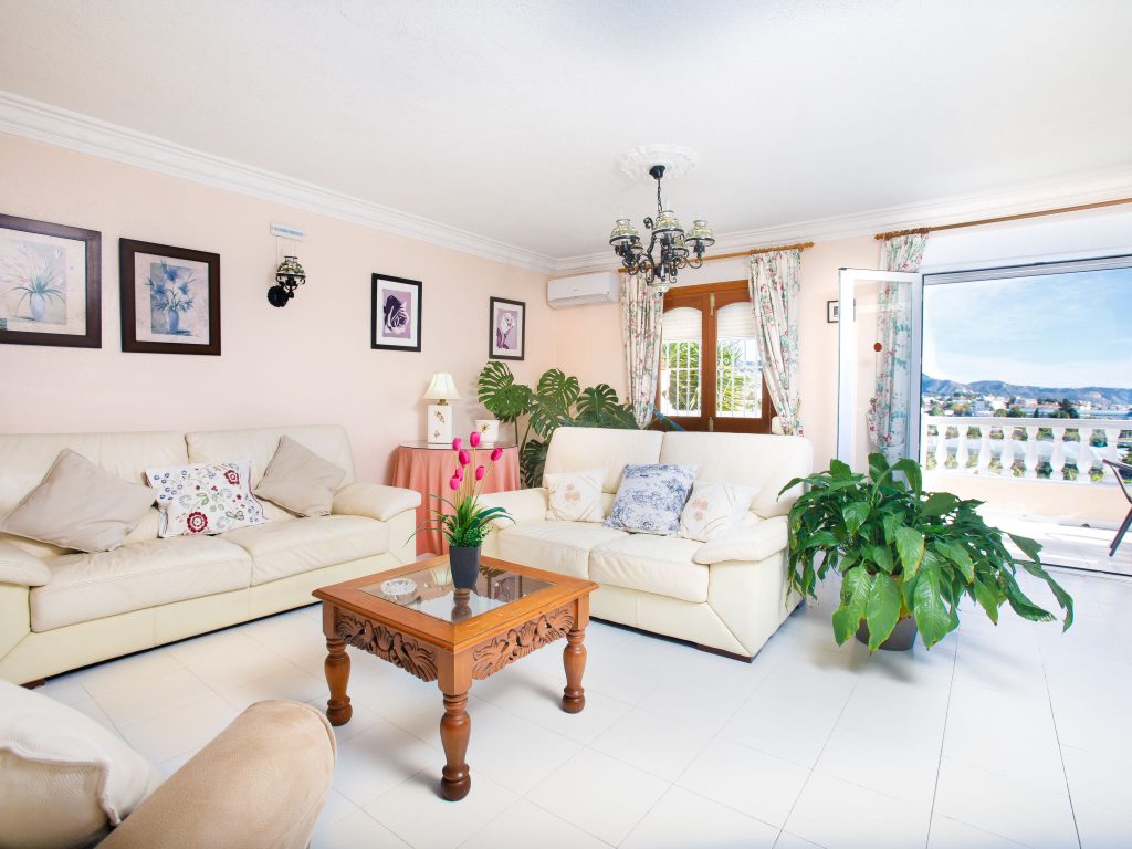 Spectacular villa with 4 bedrooms in Nerja. The villa has a living room with fireplace, digital TV, international channels and air conditioning. 1 room with 1 double bed (135 cm, length 190 cm), air conditioning. 1 room with 2 beds (90 cm, length 190 cm), air conditioning. Shower/WC, separate WC. On the lower ground floor: 1 bedroom. with 2 beds (90 cm, length 190 cm), shower/WC and air conditioning. Open kitchen (oven, dishwasher, 4 ceramic glass hob hotplates, microwave, freezer) with dining table, open fireplace and air conditioning. Exit to the terrace. Terrace-garden, lawn. Terrace furniture, barbecue, sun loungers.