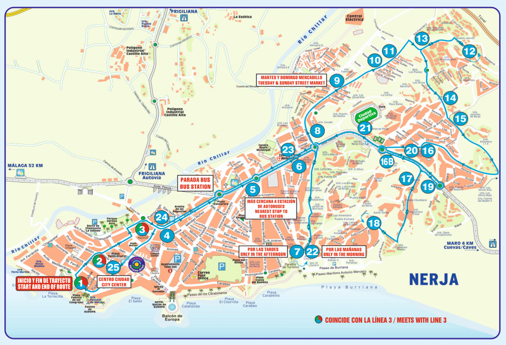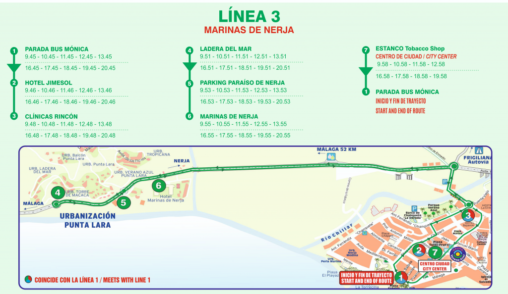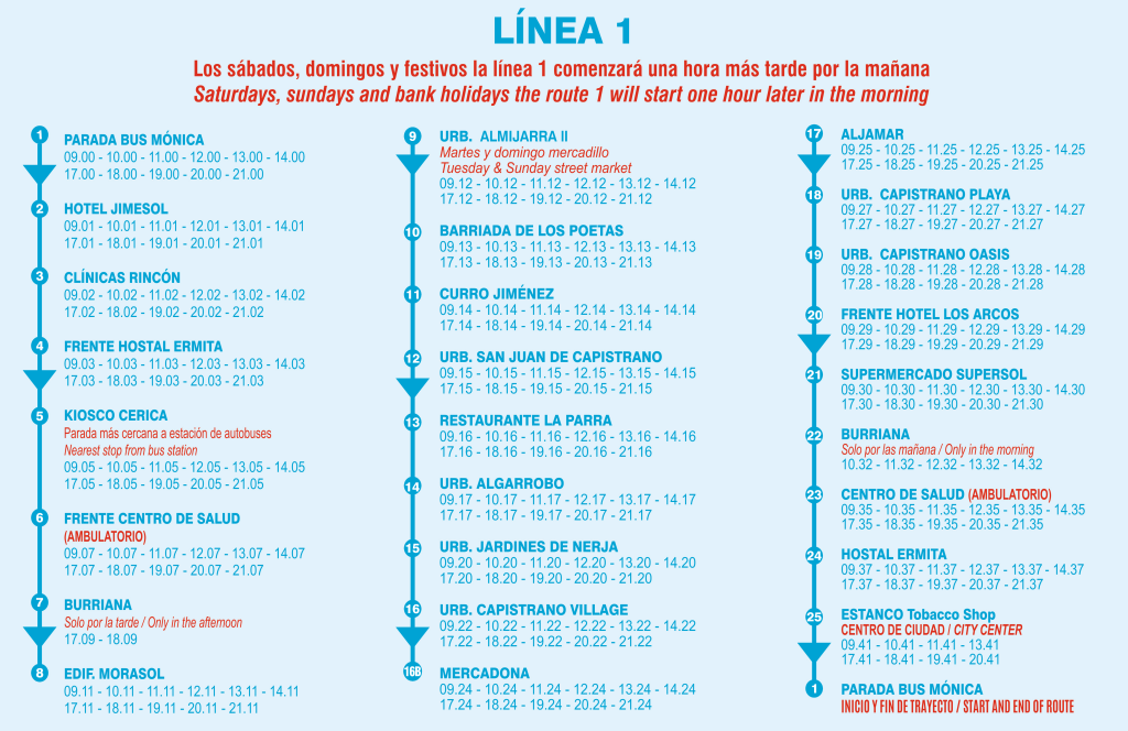 Recorrido bus Nerja: Parada de Bus Monica, Hotel Jimesol, Clinicas Rincon, Frente Hostal Ermita, Kiosco Cerica, Frente centro de Salud (Ambulatorio), Burriana Beach (solo por la tarde), Edificio Morasol, Urbanizacion ALmijara II, Barriada de los Poetas, Curro Jimenez, Urbanizacion san Juan de Capistrano, Restaurante la Parra, Urbanizacion Algarrobo, Urbanizacion Jardines de Nerja, Urbanizacion Capistrano Village, Mercadona de Capistrano cerca del Hotel Nerja Club, Aljamar, Urbanizacion Capistrano Playa, Urbanizacion Oasis de Capistrano, Frente Hotel Los Arcos, Supermercado Carrefour (antiguo Supersol), Burriana playa (solo por las maรฑanas), Centro de Salud, Hotal la Ermita, Estanco (tobacco Shop Near TuttiFrutti), Parada bus Hotel RIU Monica. << See map here >>