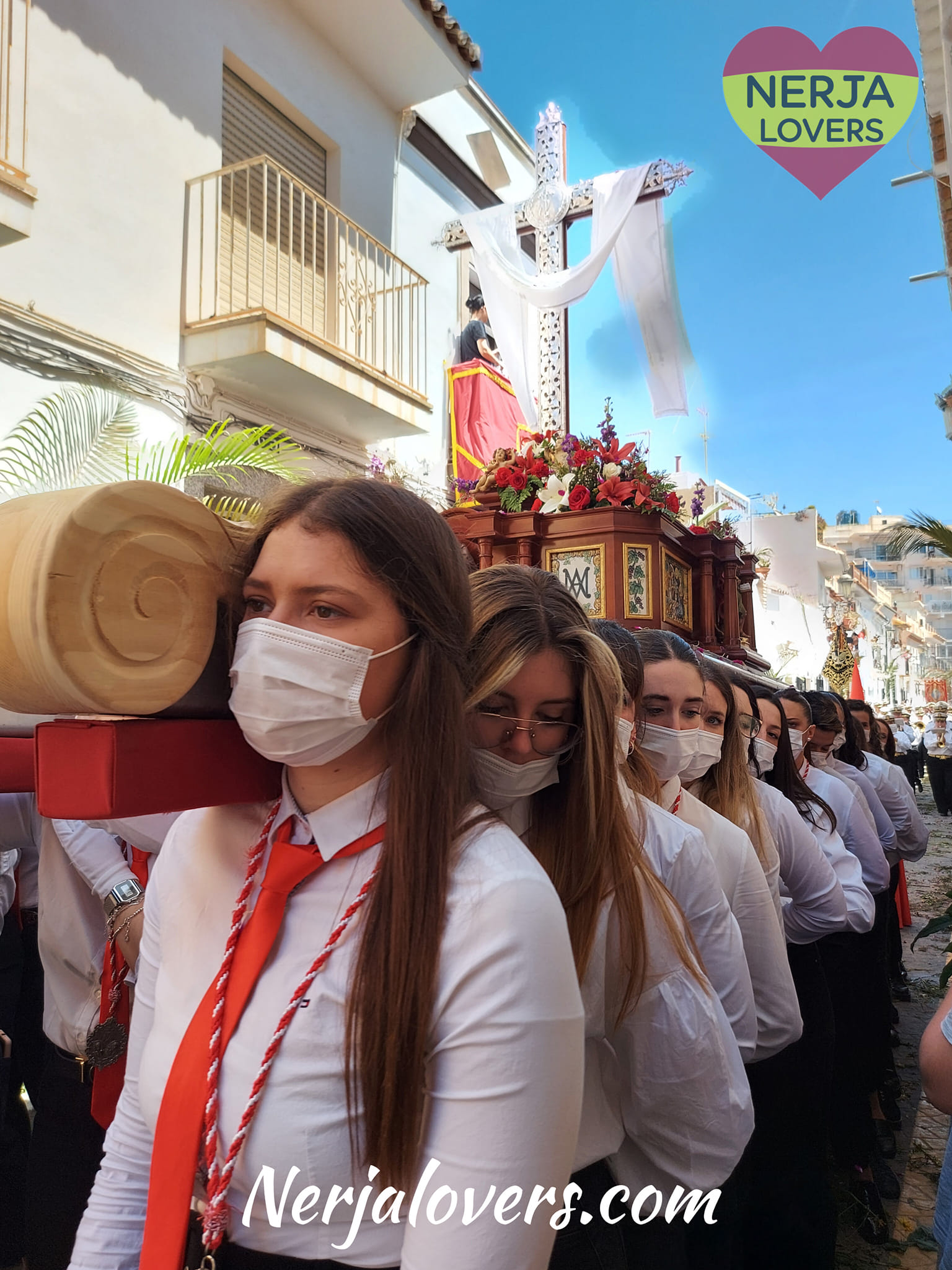 Departing from the Church of El Salvador and going along Puerta del Mar street, Pistada street, Arropicros street, Huertos street, Frigiliana street, Carretas street, Pintada street, Angustias street, Ermita street, Granada street, Cavana square, Carmen street, and Pasco Balcón de Europa to the Temple. The Virgen del Carmen Musical Group from Torrenueva and the Nerja Music Band accompany