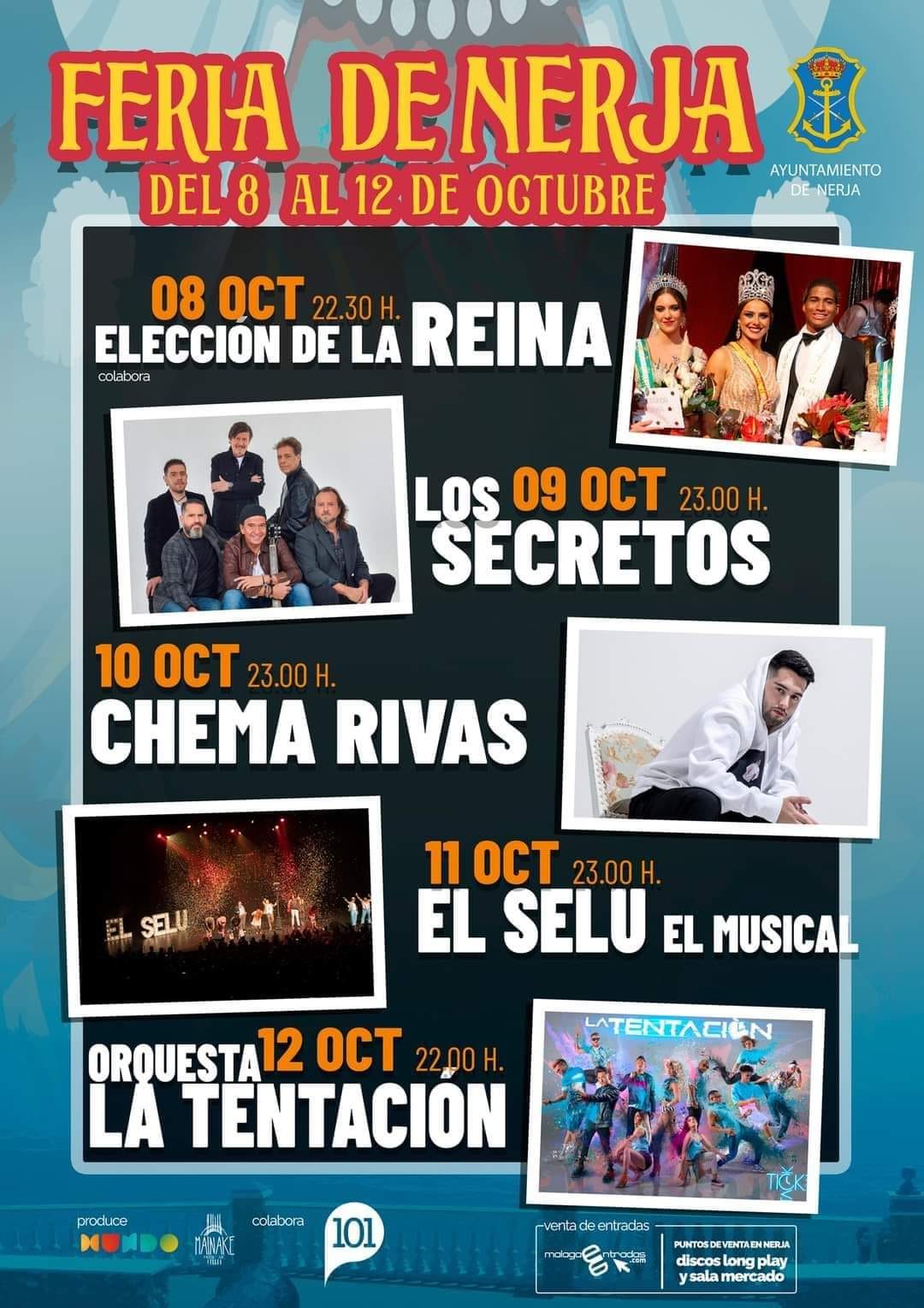 Uno de los atractivos más destacados de la Feria de Nerja es su cartel de conciertos gratuitos en la Plaza de España. En 2025, la Feria contará con tres grandes actuaciones de artistas nacionales que prometen poner a todo el público a bailar y cantar. Los conciertos serán los siguientes: