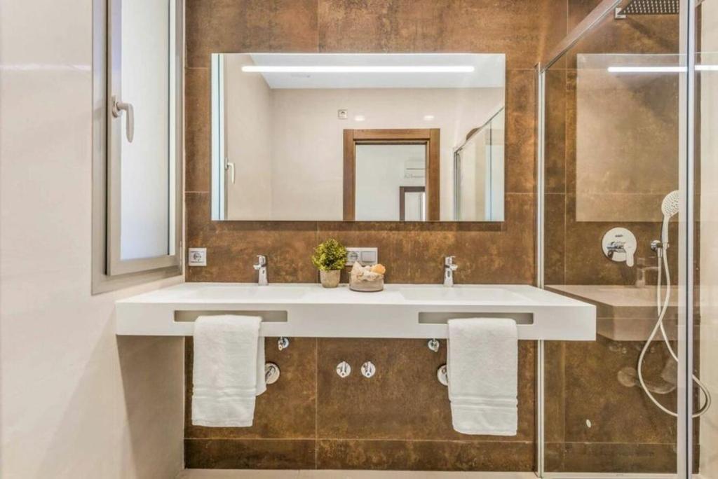 The villa has 4 bedrooms, a flat-screen TV with satellite channels, an equipped kitchen with a dishwasher and a microwave, a washing machine, and 6 bathrooms with a shower.